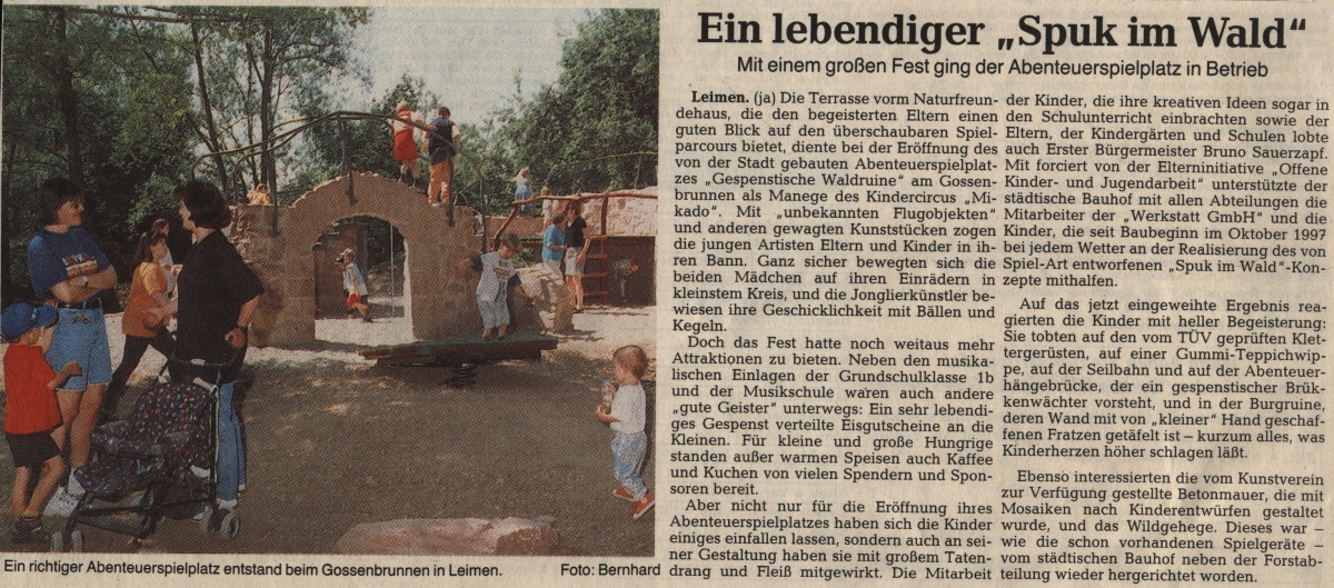Helga Duczek koordinierte und organisierte schon von 1997 bis 1998 die Elterninitiative zur aktiven Mitgestaltung des Abenteuerspielplatzes "Spuk im Wald". Der Spielplatz wurde gemeinsam mit der Firma "Die Werkstatt GmbH" in Leimen gestaltet. Im April 1998 initiierte die Elterninitiative zusammen mit dem Kunstverein Leimen ein einwöchiges, offenes Ferienangebot zur Spielplatzmitgestaltung. Vor Ort wurde das Thema "Spuk im Wald" künstlerisch gestaltend in ein Mosaikwandbild umgesetzt.