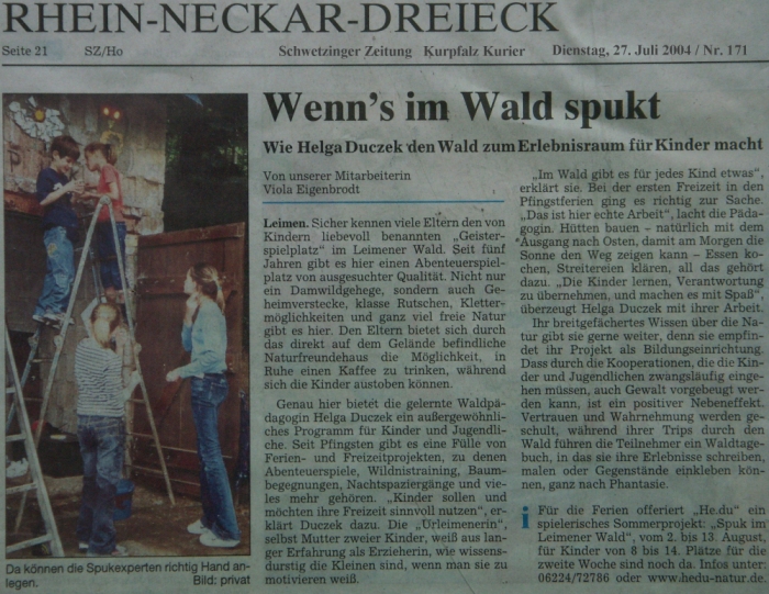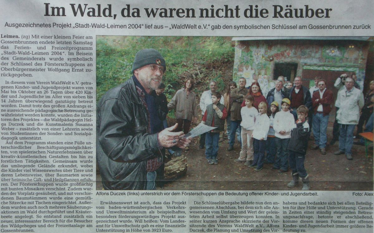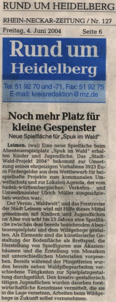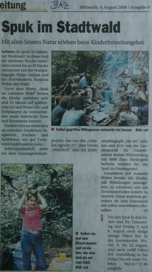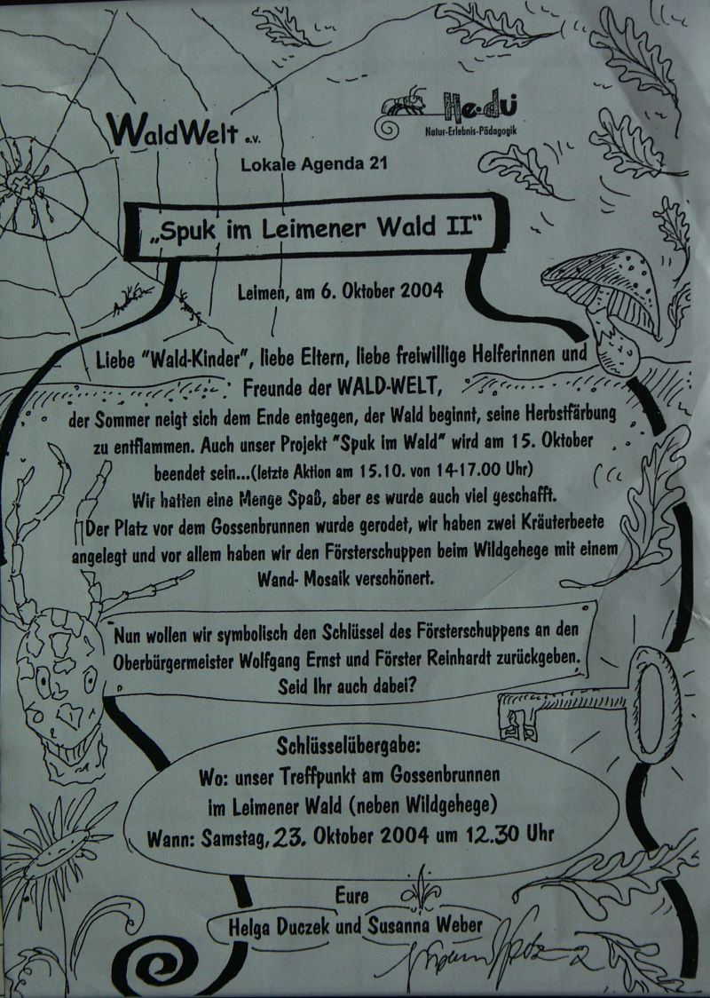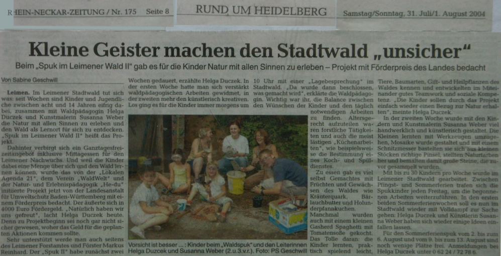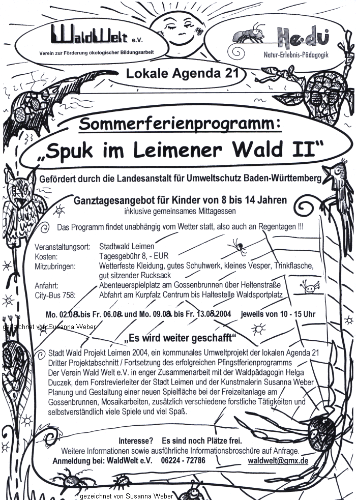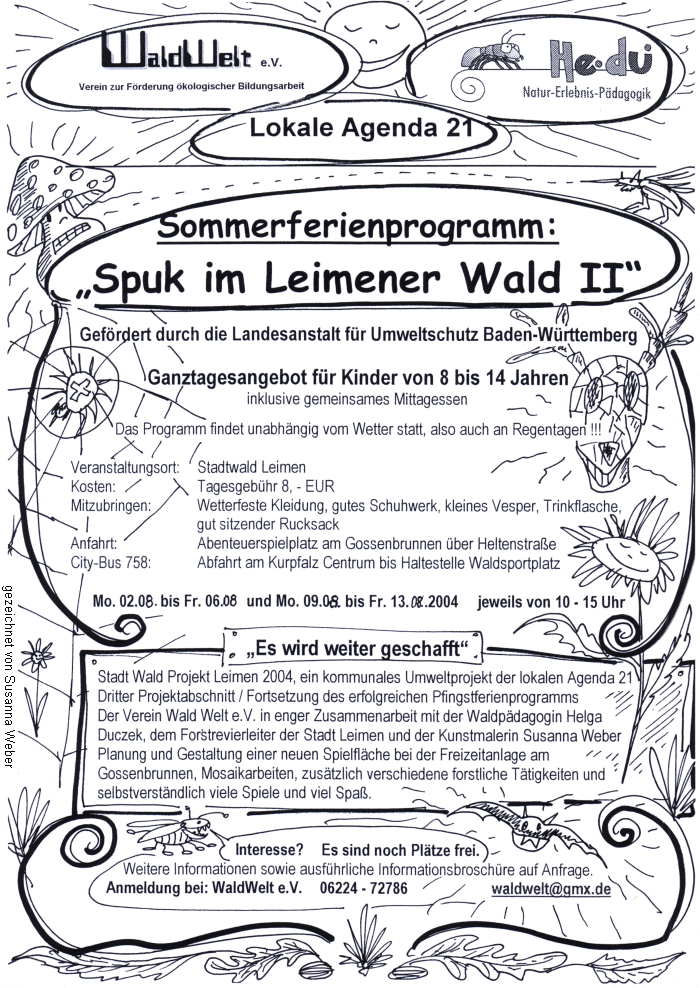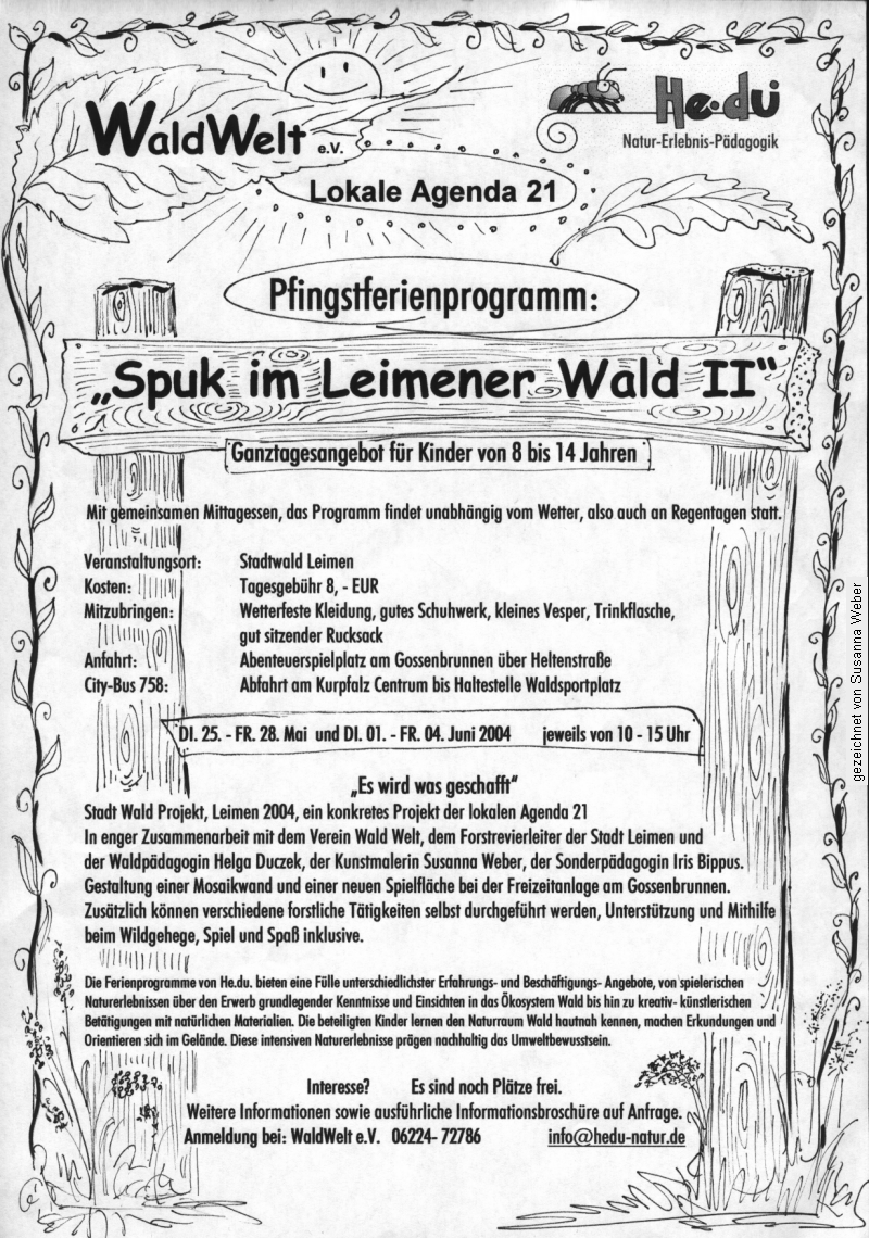|  Das Stadtwaldprojekt "Spuk im Wald II" Leimen 2004, ein konkretes Projekt der lokalen Agenda 21, ist ein innovatives Ferien- und Freizeitprogramm, welches der Verein WaldWelt e.V. gemeinsam mit der Naturpädagogin Helga Duczek, der Kunstmalerin Susanna Weber und in enger Zusammenarbeit mit dem Forstrevierleiter der Stadt Leimen Markus Reinhard und der Sonderpädagogin Iris Bippus veranstaltet.