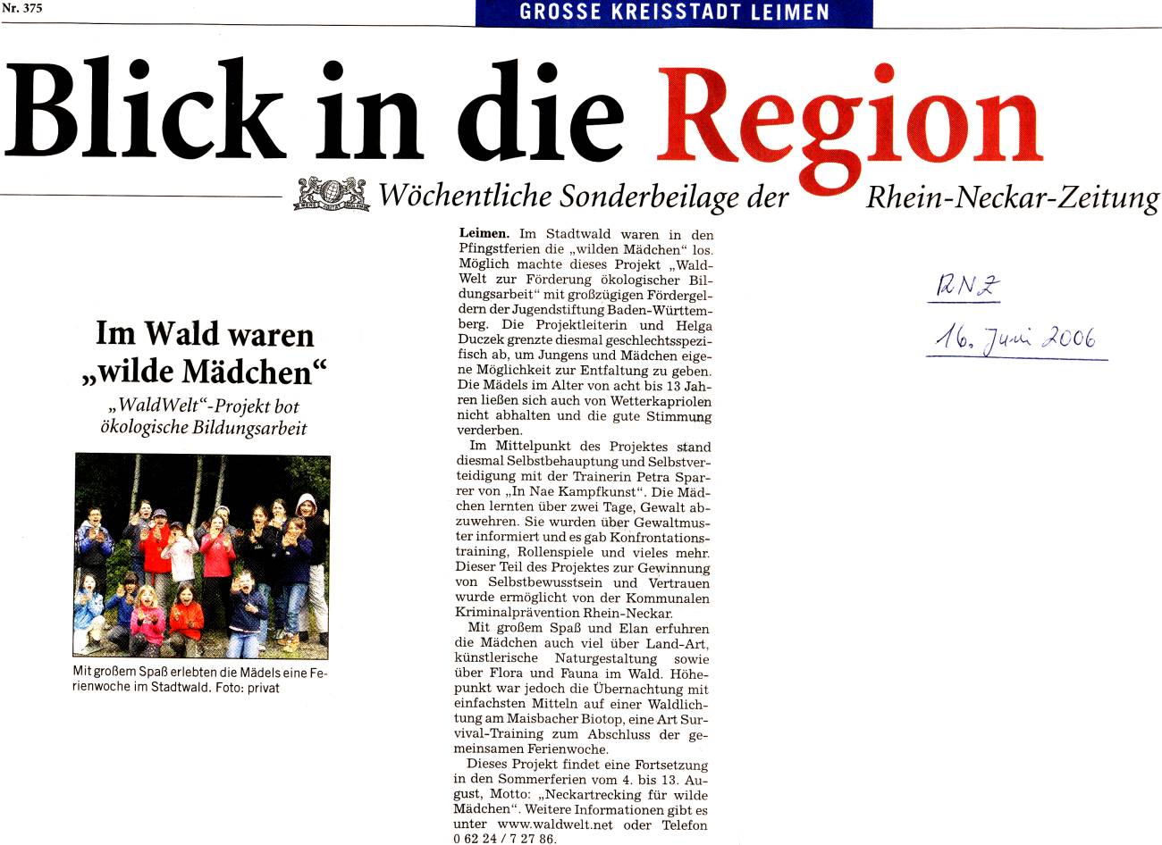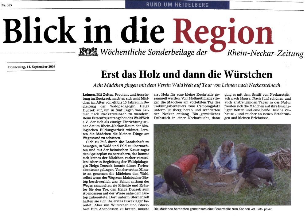 Der Verein WaldWelt e.V. führt dieses Jahr mit dem Projekt "Wald für wilde Mädchen" ein neues, innovatives Jugendförderprogramm in Leimen und im Rhein-Neckar-Kreis durch. Im Vordergrund stehen sowohl naturorientierte Wissensvermittlung als auch Erwerb und Erweiterung grundlegender sozialer Kompetenzen. Der überwiegend handlungsorientierte Ansatz ermöglicht es den heimischen Wald von Grund auf kennen zu lernen und vielfältigen Einblicken in das Ökosystem zu gewinnen. Mit Fördergeldern der Jugendstiftung Baden-Württemberg und Unterstützung der kommunalen Kriminalprävention Rhein-Neckar e.V. kann das Projekt nun realisiert werden.
